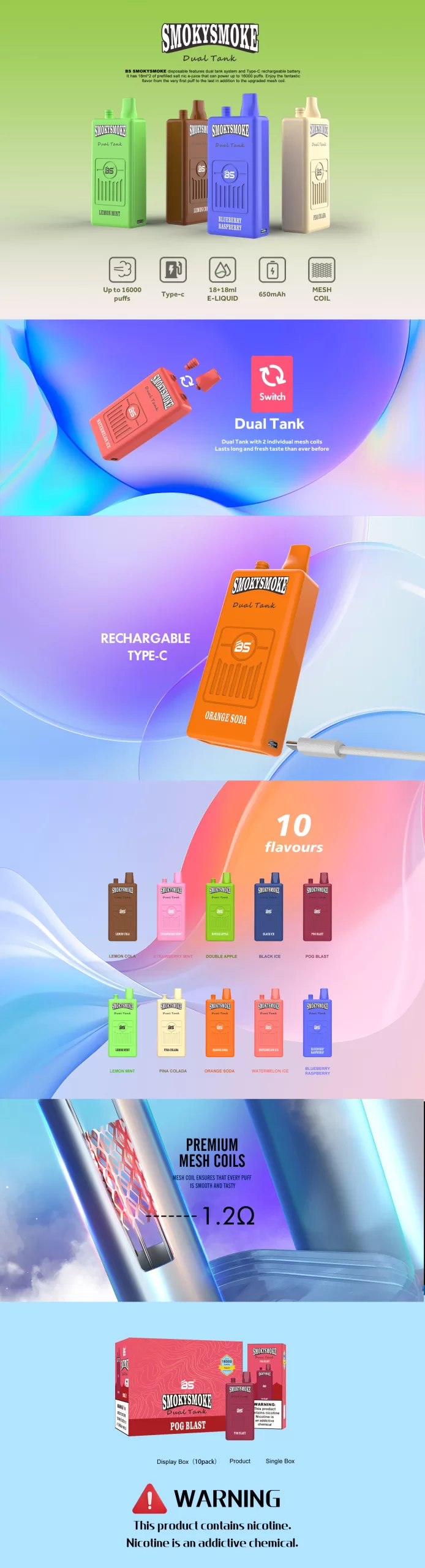 Experience the pinnacle of vaping excellence with the Smokysmoke Dual Tank 16000 Puffs Disposable Vape, a truly innovative device that redefines your vaping journey. Featuring a groundbreaking Dual Tank Design, this vape is equipped with two distinct Mesh Coils that not only extend its lifespan but also ensure a consistently fresh flavor profile with every puff—up to an impressive 16,000 puffs. Each time you switch tanks, you’ll enjoy a revitalized vaping experience as if you were using a brand-new device.